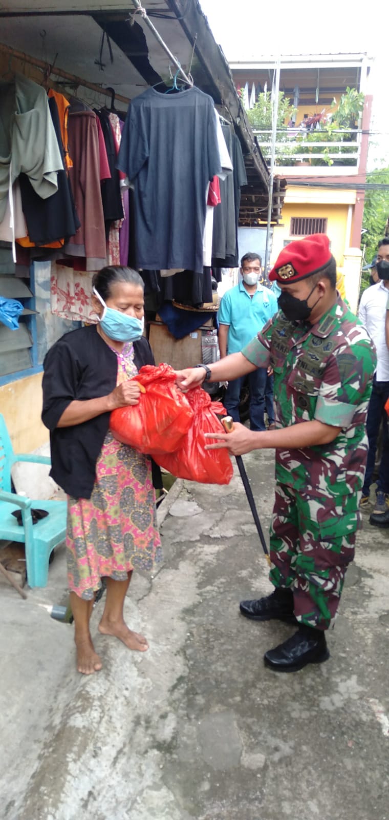” Kopassus berusaha ada dalam membantu masyarakat, dimasa pandemi ini,” terang Mayor Inf Alzaki usai membagikan sembako kepada warga.