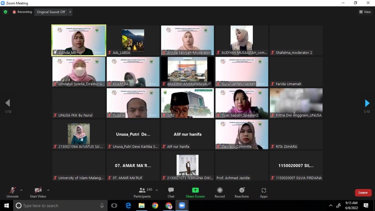 AAL, Surabaya (8/6).Lima perwakilan Taruna (Akademi Angkatan Laut) Tingkat II dan Tingkat I mengikuti Webinar Grand Opening “Internal English Debate of UNUSA Student for NUDC 2022” dari Universitas Nahdlatul Ulama Surabaya (UNUSA) tahun 2022 di Gedung Galasa Departemen Ilmu Pengetahuan dan Teknologi (Depiptek) Kesatrian AAL, Bumimoro Surabaya, Rabu (8/6).