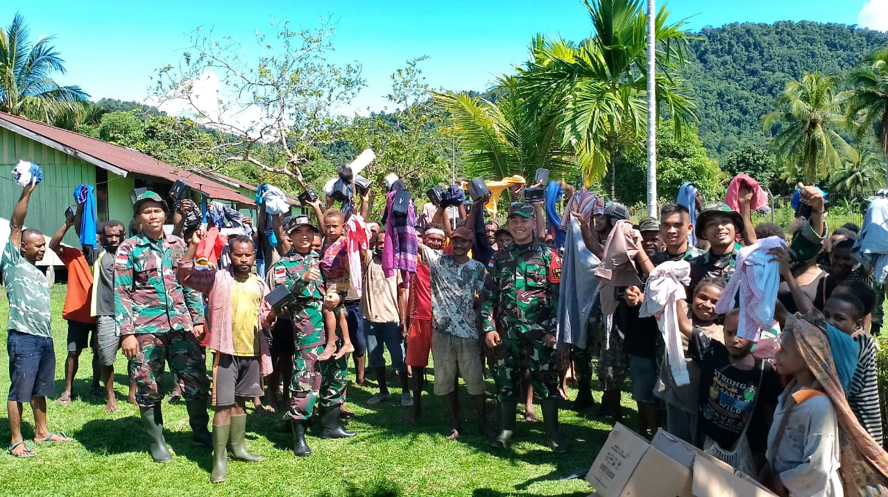 Gelar Bantuan Sosial, Satgas Pamtas Yonif 126/KC Bagikan Pakaian Layak Pakai Kepada Warga Perbatasan Papua