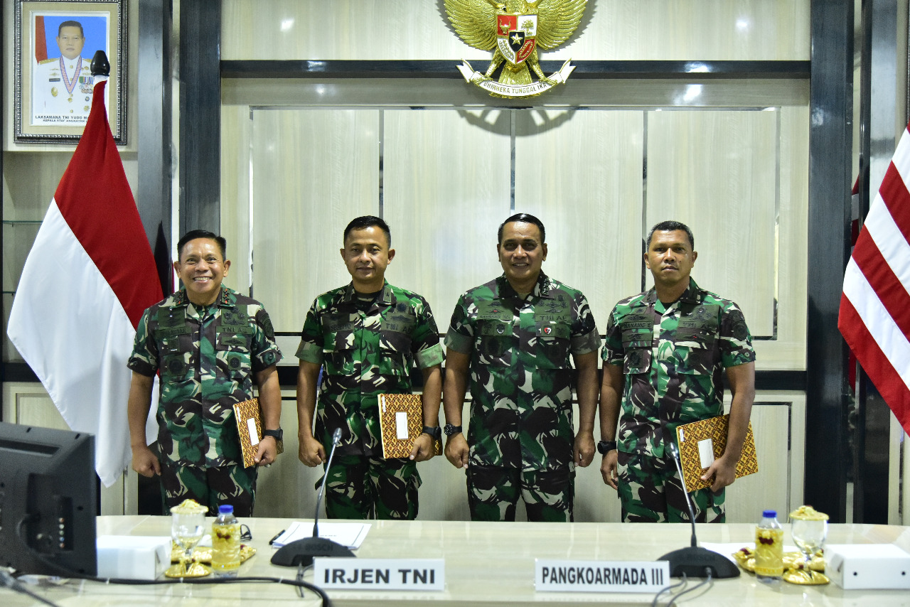 TNI AL/ Koarmada III. Panglima Komando Armada (Pangkoarmada) III, Laksamana Muda TNI Irvansyah, S.H., CHRMP., M.Tr. Opsla., bersama Irdam XVIII/Kasuari Brigjen TNI Eko Susetyo, M.M., M.Tr.(Han), Komandan Korem 181/PVT Brigjen TNI Wawan Erawan S.E M.M dan Wadan Pasmar 3 Kolonel Mar Nanang Saefulloh, S.E., serta Aslog Komandan Lantamal XIV Kolonel Laut (T) Mohammad Ali Nugroho, S.T., M.Si., mengikuti acara Pembacaan Taklimat Akhir Audit Kinerja Itjen TNI Periode II TA 2022 di Komando/Satuan TNI Wilayah Papua Barat yang berlangsung di Ruang Rapat Pangkoarmada III, Mako Koarmada III, Katapop Kabupaten Sorong Papua Barat, Kamis (16/06/2022).