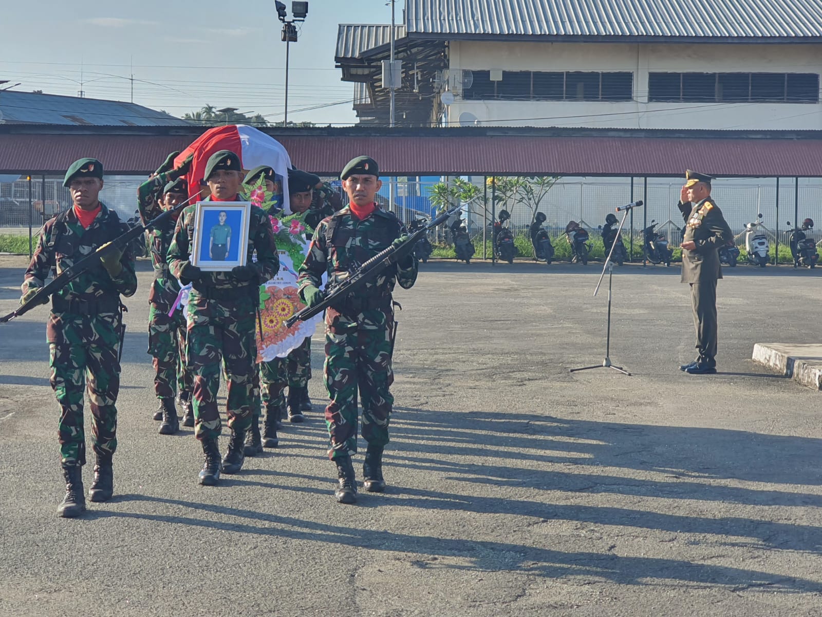 JAKARTA – Komandan Korem 172/PWY Brigjen TNI J.O Sembiring memimpin upacara pengantaran jenazah anggota Satgas Yonif PR 431/SSP Pratu Anumerta Beryl Kholif Al Rohman yang akan diberangkatkan ke kampung halamannya.