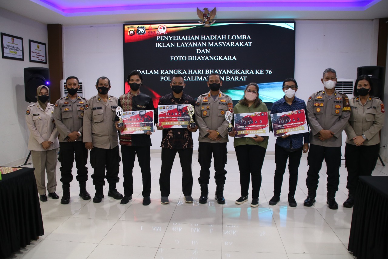 Pontianak,Kalbar -Kabid Humas Polda Kalbar Kombes Pol Jansen Avitus Panjaitan, S.I.K., M.H. menyerahkan hadiah kepada para pemenang lomba iklan layanan masyarakat dan foto Bhayangkara dengan tema “Polri yang Presisi Mendukung Pemulihan Ekonomi dan Reformasi Struktual untuk Mewujudkan Indonesia Tangguh-Indonesia Tumbuh”, di Mapolda Kalbar.