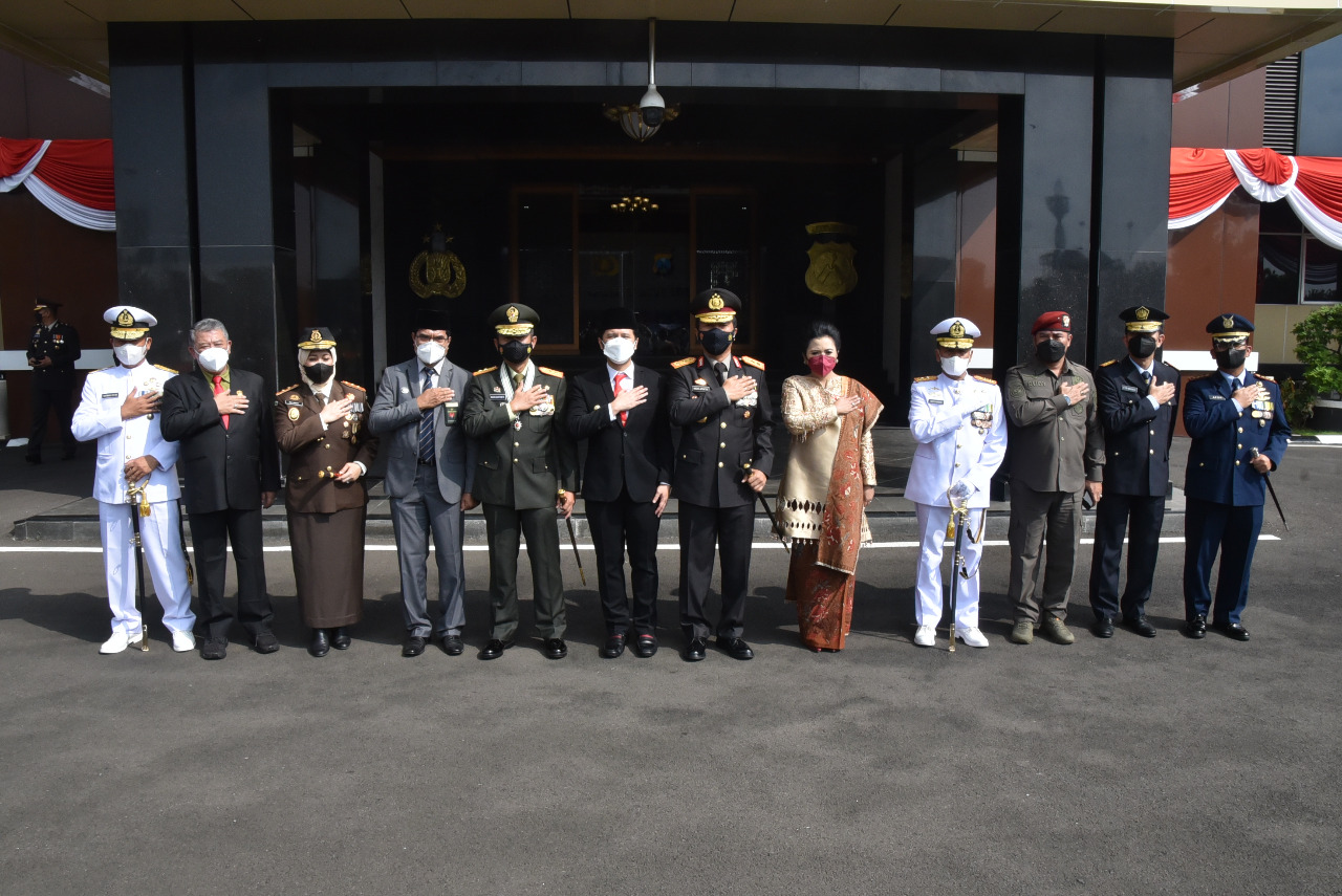 Tampak ikut hadir dalam upacara HUT ke-76 Bhayangkara di Polda Jatim antara lain Pangdam V Brawijaya Mayjen TNI Nuchahyanto, Kapolda Jatim Irjen Pol Nico Afinta, Wagub Jatim Emil Dardak, Ketua DPRD Provinsi Jatim, Kasarmada ll, Danpasmar 2, Kajati Jatim, Wadan Lantamal V , serta Danlanud Mulyono.