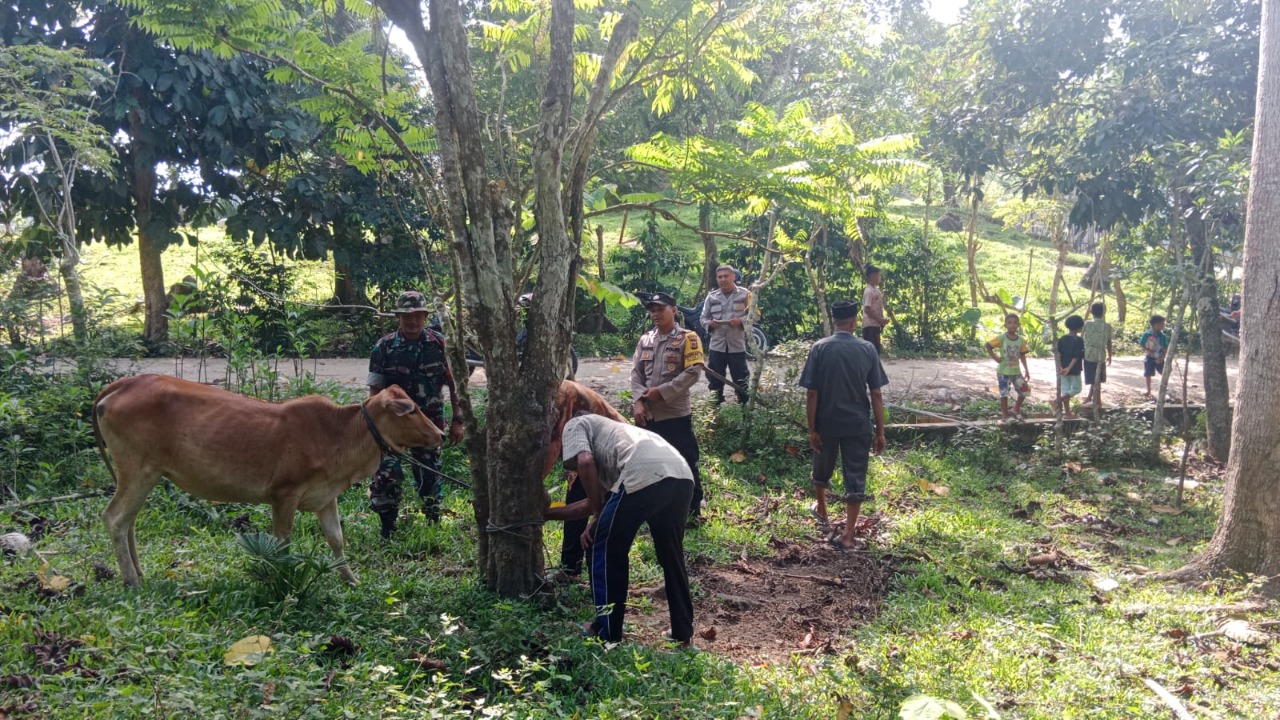 Aceh Timur – Ditengah mewabahnya Penyakit Mulut dan Kuku (PMK) terhadap sejumlah hewan ternak sapi di berbagai wilayah, Koramil 04/Peureulak Kodim 0104/Aceh Timur bersama Polsek dan instansi terkait, melaksanakan pengawasan dan pendataan terhadap ternak sapi milik warga, Desa Seuenubok Aceh, Kecamatan Darul Ihsan, Aceh Timur, Sabtu (16/07/2022).