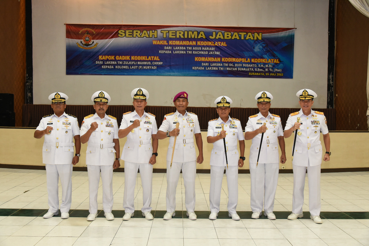 Kodiklatal. Surabaya, 25 Juli 2022,—Komandan Komando Pembinaan Doktrin, Pendidikan dan Latihan TNI AL (Dankodiklatal) Letnan Jenderal TNI (Mar) Suhartono memimpin serah terima tiga jabatan strategis di jajaran Kodiklatal yakni, Wakil Komandan Kodiklatal, Kepala Kelompok Tenaga Pendidik (Kapokgadik), serta Komandan Komando Pendidikan Operasi Laut (Dankodikopsla) bertempat di Gedung R.E. Martadinata, Kesatrian Bumimoro Kodiklatal Surabaya, pada Senin (25/7).