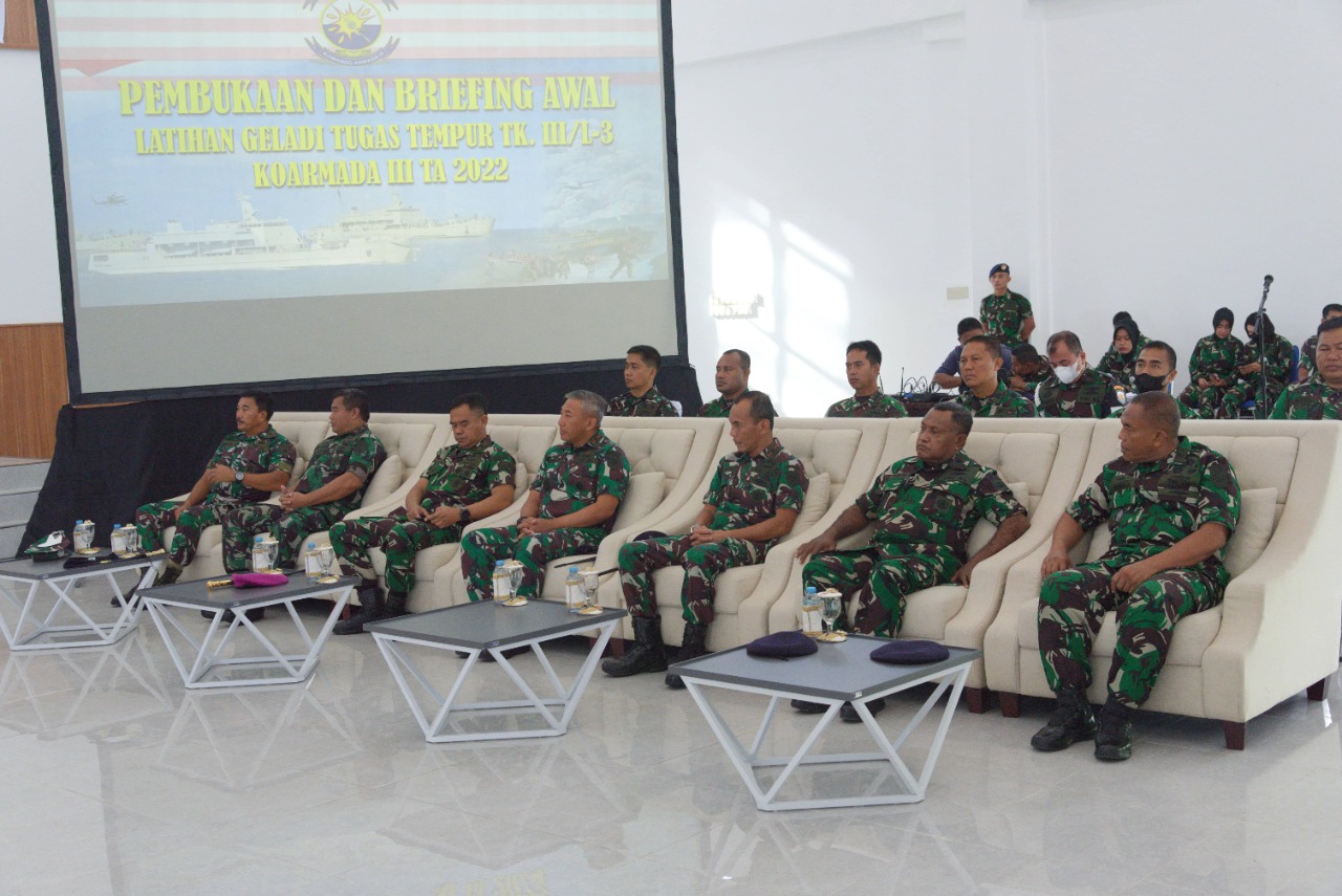 TNI AL/ Koarmada III. Panglima Komando Armada (Pangkoarmada) III, Laksamana Muda TNI Irvansyah, S.H., CHRMP., M.Tr. Opsla, memimpin Briefing Awal Latihan Geladi Tugas Tempur/ Glagaspur Tingkat – III / L3 Koarmada III TA. 2022 di Gedung Serbaguna Mas Pardi Mako Koarmada III, Katapop Kabupaten Sorong Papua Barat. Senin (25/07/22).