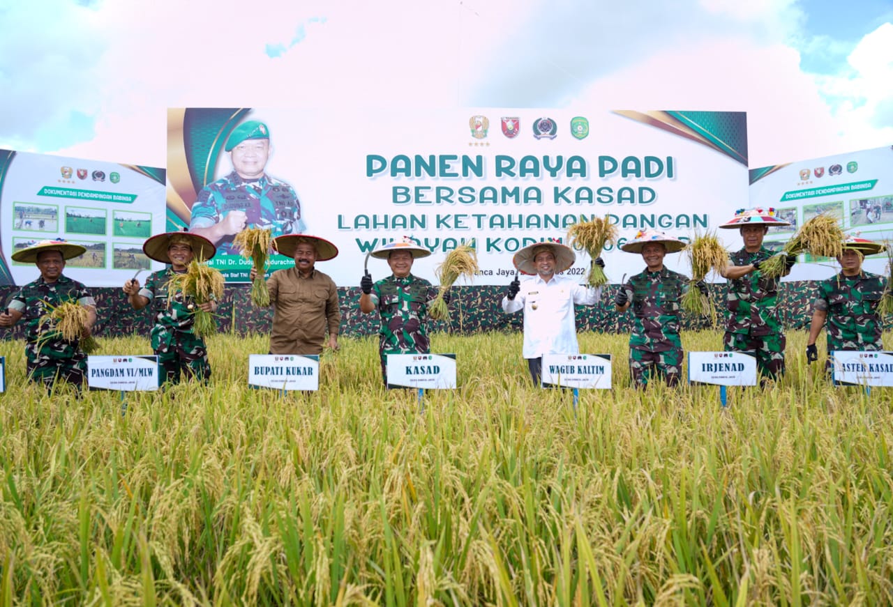 JAKARTA, tniad.mil.id -Kepala Staf Angkatan Darat (Kasad) Jenderal TNI Dr. Dudung Abdurachman melaksanakan panen raya padi dalam rangka wujudkan Ketahanan Pangan Nasional sesuai instruksi Presiden RI Joko Widodo untuk mengoptimalkan lahan-lahan tidur untuk ditanami dengan berbagai tanaman pangan. Acara ini merupakan rangkaian kegiatan penutupan program TMMD ke-114 di wilayah Kodim 0906/Tgr Kabupaten Kutai Kartanegara, Kalimantan Timur, Rabu (24/8/2022).