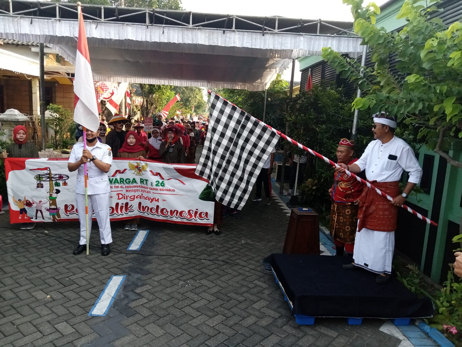 SIdoarjo,(28/08).,1550 Warga RW.08 Komplek Perumahan TNI AL Jalagriya Candi Sidoarjo melaksanakan Jalan sehat dalam rangka merayakan HUT Kemerdekaan RI Ke-77, Pemberangkatan kloter pertama oleh Lurah Kedung Kendo Candi Sidoarjo H.Hartoyo yang di dampingi Ketua RW 08.H. Hadi Purnomo(28/08).