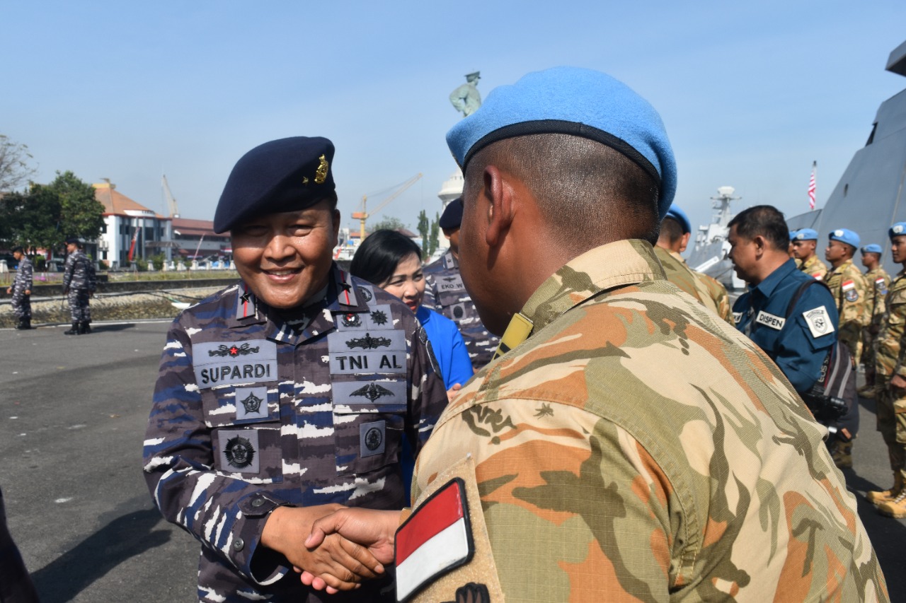 Kedatangan Satgas tersebut disambut Langsung oleh Kepala Staf TNI Angkatan Laut (Kasal) Laksamana TNI Yudo Margono didampingi Ketua Umum (Ketum) Jalasenastri Ny. Vero Yudo Margono di Dermaga Madura Tengah Koarmada II Ujung Surabaya. Sabtu (3/9).