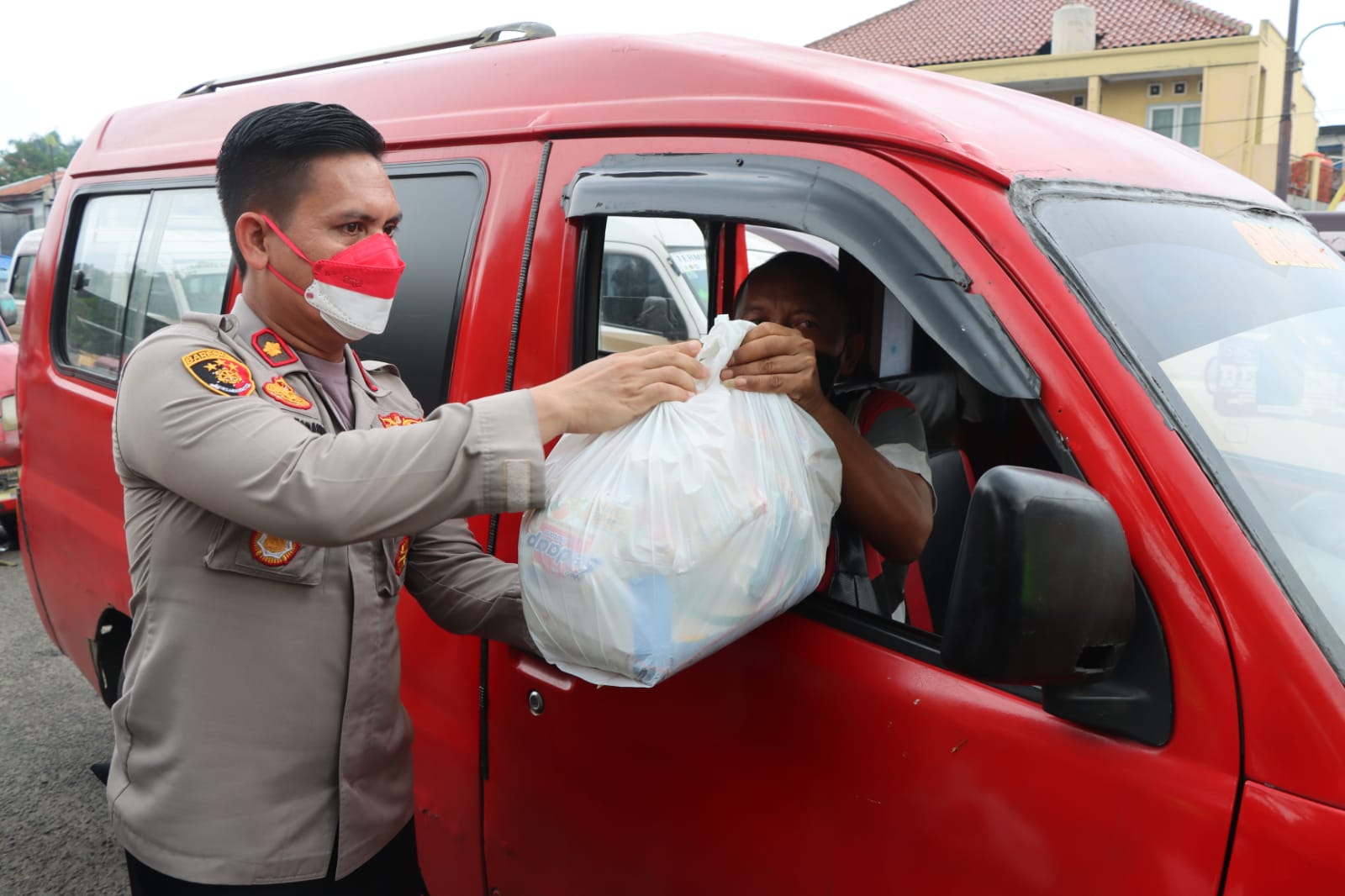 Kepolisian Resort Metro Kota Tangerang, Minggu, (11/9) membagikan paket sembako sebanyak 100 paket bagi sopir angkutan perkotaan (angkot) di Terminal Cimone.