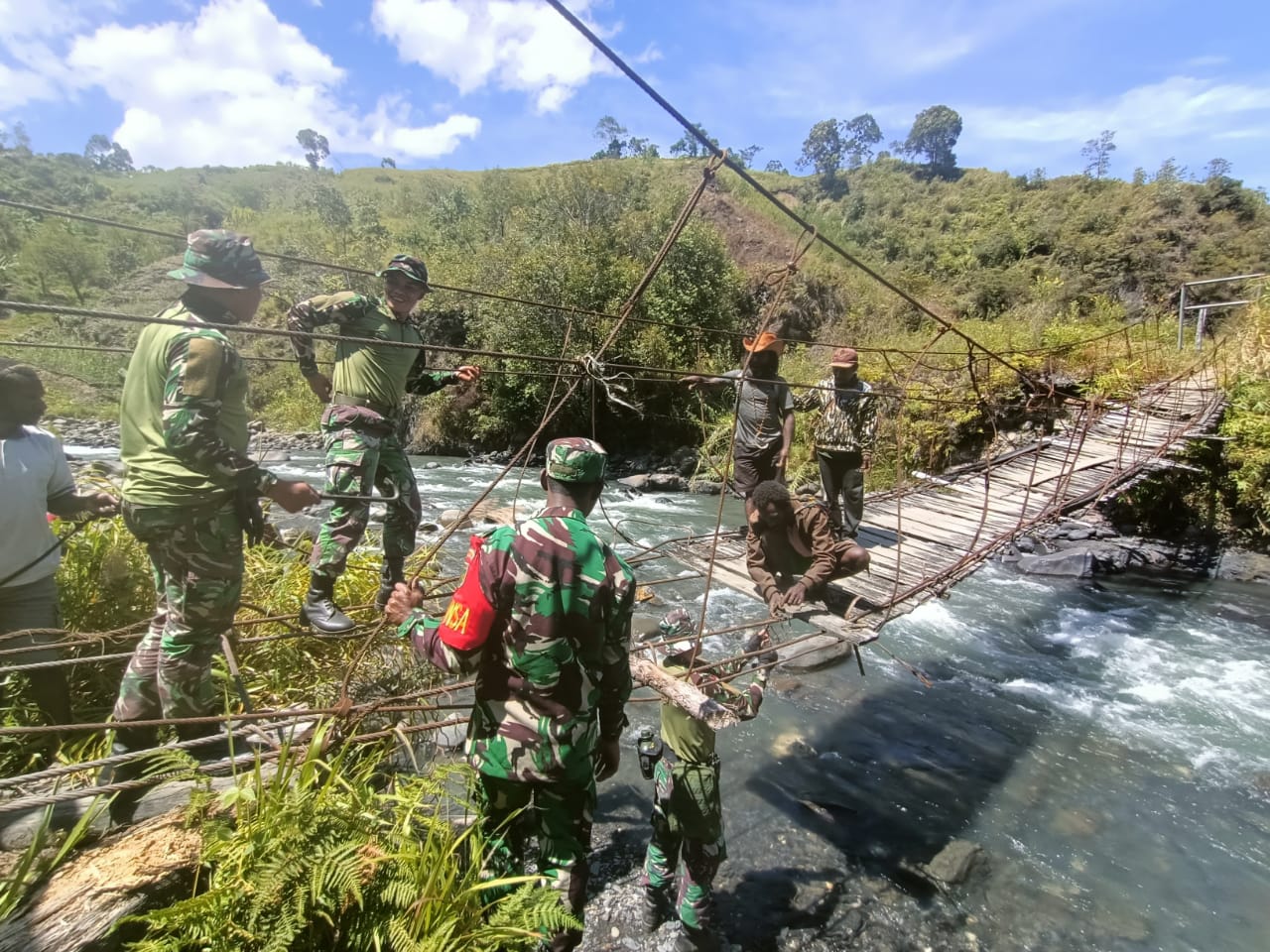 Personel Koramil 1714-02/Ilu yang dipimpin Danramil melaksanakan perbaikan jembatan Dolinggame Kampung Dolinggame, Distrik Ilu, Kabupaten Puncak Jaya, Papua Tengah, Rabu (5/10/2022).