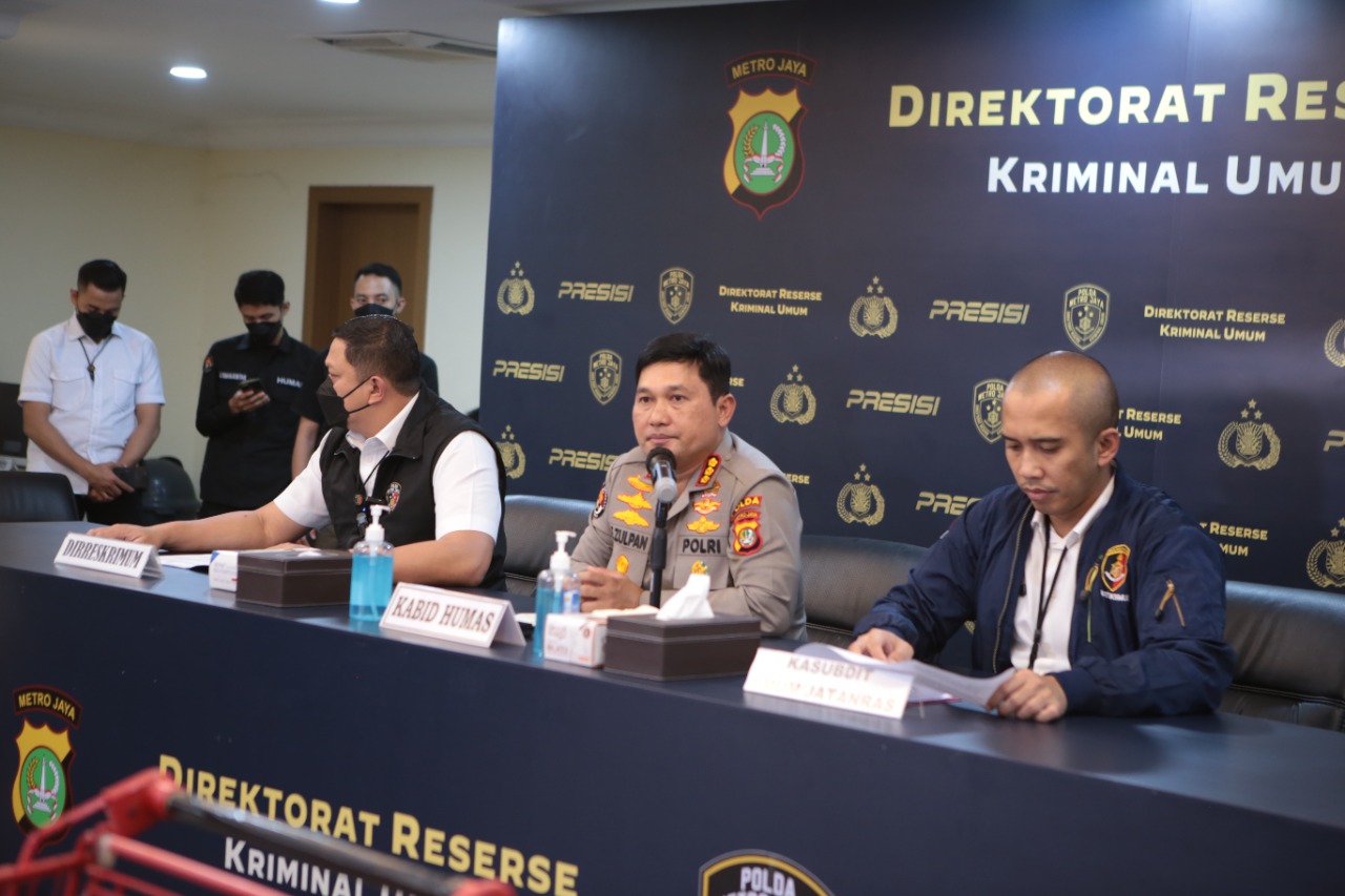 dalam jumpa pers dihadiri Kabidhumas Polda Metro Jaya Kombes Pol E. ZULPAN, S.I.K., M.Si., Direktur Reskrimum Polda Metro Jaya Kombes Pol HENGKI HARYADI, S.I.K., M.H., Kasubdit Jatanras Dirreskrimum Polda Metro Jaya AKBP INDRAWIENNY PANJI YOGA S.I.K.