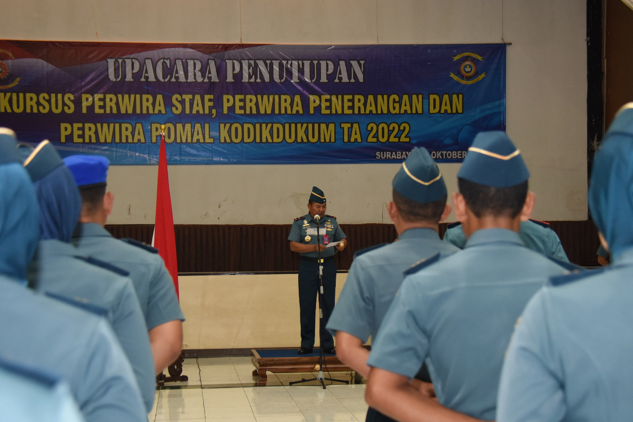 Kodiklatal Surabaya, 28 Oktober 2022,Sebanyak 48 perwira selesai mengikuti Kursus Perwira Staf, Perwira Penerangan dan Perwira Polisi Militer Angkatan Laut (Pomal) di Komando Pendidikan Dukungan Umum (Kodikdukum) Komando Pembinaan Doktrin, Pendidikan dan Latihan TNI AL (Kodiklatal). Ketiga kursus tersebut ditutup secara resmi oleh Dankodikdukum Laksamana Pertama TNI Budi Raharjo di Gedung R.E. Martadinata, Kodiklatal, Bumimoro, Surabaya, Jumat (28102022).