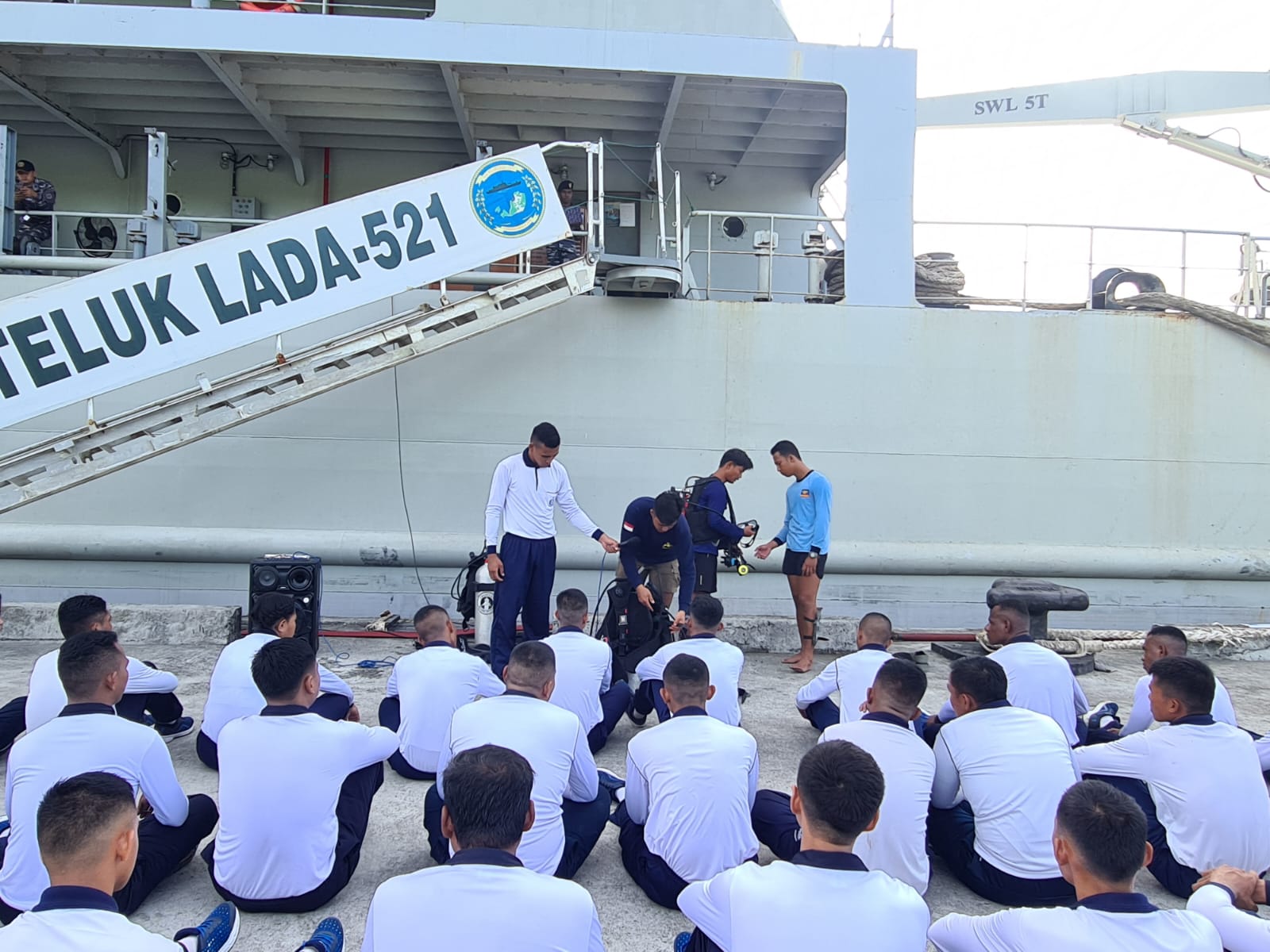 Lebih lanjut Komandan KRI Teluk Lada-521 menyampaikan bahwa refreshment kemampuan selam dasar tersebut didukung instruktur dari Prajurit Satkopaska, Dislambair Koarmada III serta Marinir dari Pasmar 3 yang ikut serta dalam pelaksanaan tugas operasi yang sama, adapun materi yang dilatihkan adalah Bongkar Pasang Alat Selam (Scuba) dan Kemampuan mengambang di air (Water Trappen) serta Prosedur menyelam (Water Entry).