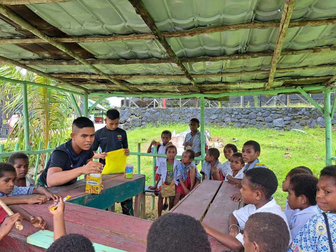 Kab.Keerom – Satgas Pamtas Yonif 132/BS Pos Kalimao memberikan motivasi belajar kepada adik-adik Siswa SD yang baru pulang sekolah. Kalimao, Distrik Waris, Kab.Keerom, Papua. Pada hari Sabtu (19/11).