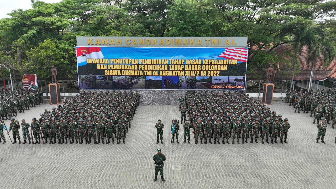 TNI AL. Kodiklatal. Surabaya, 1 Februari 2023,-Sebanyak 936 Siswa Pendidikan Pertama Tamtama (Dikmata) TNI AL Angkatan XLII Gelombang 2 Tahun 2022 dinyatakan lulus dari Tahap Pendidikan Dasar Keprajuritan (Diksarrit), yang dilanjutkan ke Tahap Pendidikan Dasar Golongan (Diksargol). Kelulusan tersebut ditandai dalam Upacara Penutupan Pendidikan Sarrit (Dasar Keprajuritan) dan Pembukaan Pendidikan Dasar Golongan (Sargol), yang digelar di Lapangan Kawah Candradimuka Pusat Latihan Pendidikan Dasar Militer (Puslatdiksarmil) Kodiklatal di Juanda , Rabu (1/2/2023).
