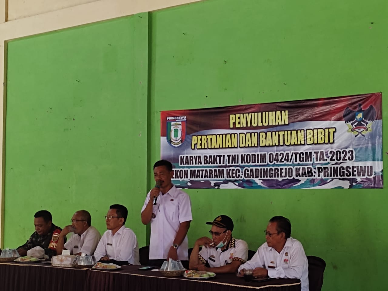 Kepala pekon Mataram dalam sambutannya mengatakan bahwa pemberian penyuluhan pertanian dan bantuan bibit merupakan karya bakti TNI Kodim 0424/TGM TH 2023